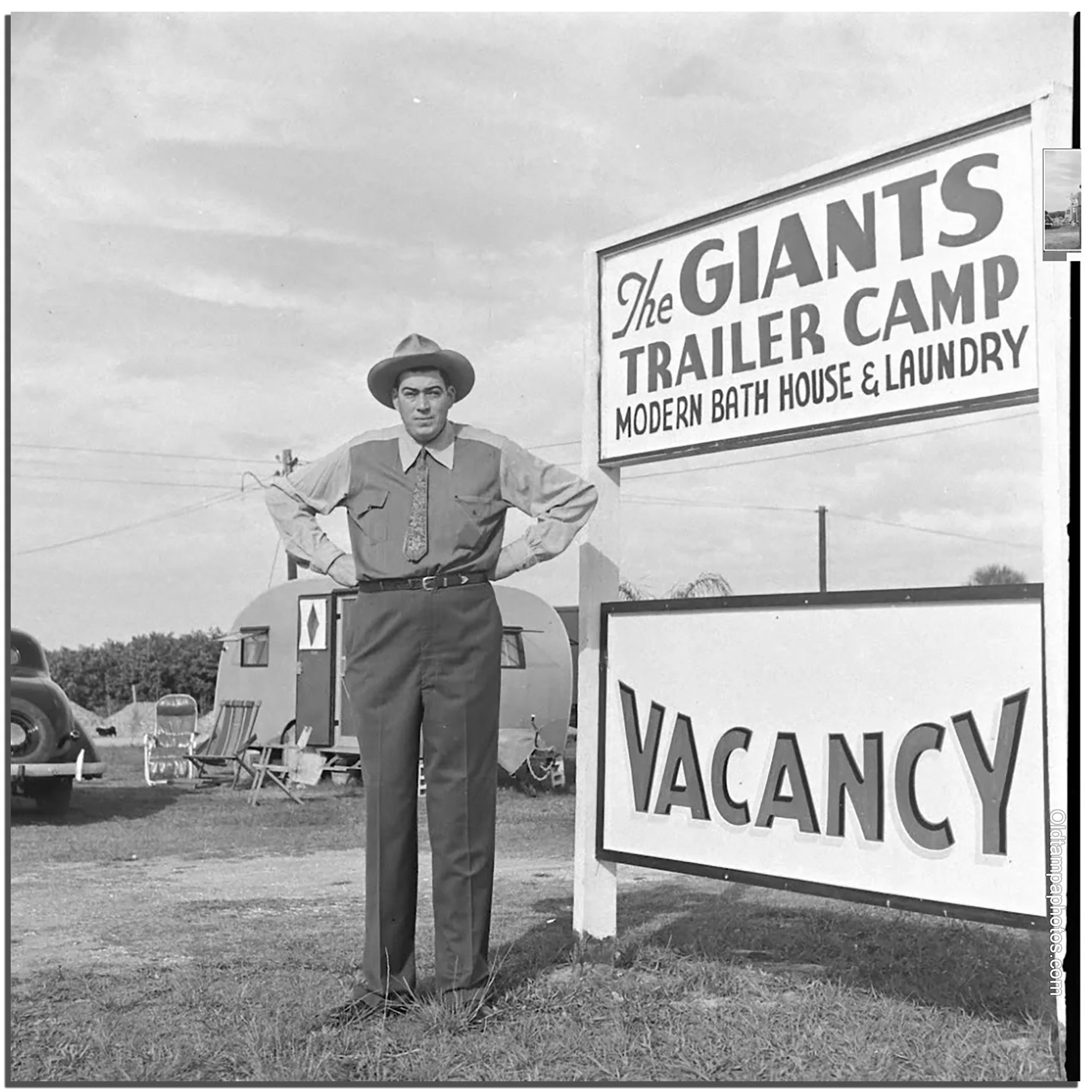 By the 1940s, Al and Jeanie had retired from the traveling life and settled in Gibsonton, Florida—a town that became synonymous with carnival culture. They adopted two children and opened Giant’s Fish Camp and Marina after rebuilding a run-down one-room bar. It was a 3 ½-acre complex of buildings that included a restaurant, cottages, a hotel, a bait shop, and their home. The Fish Camp quickly became more than just a business; it was a haven where carnival workers spent their winters, swapping stories and living side by side. Tourists soon followed, eager to catch a glimpse of the legendary couple who embodied the spirit of the midway. Seeing the camp poised on the side of U.S. 41 was sometimes tricky, since truckers parked their rigs on both sides of the highway at the open-24-hour restaurant.
