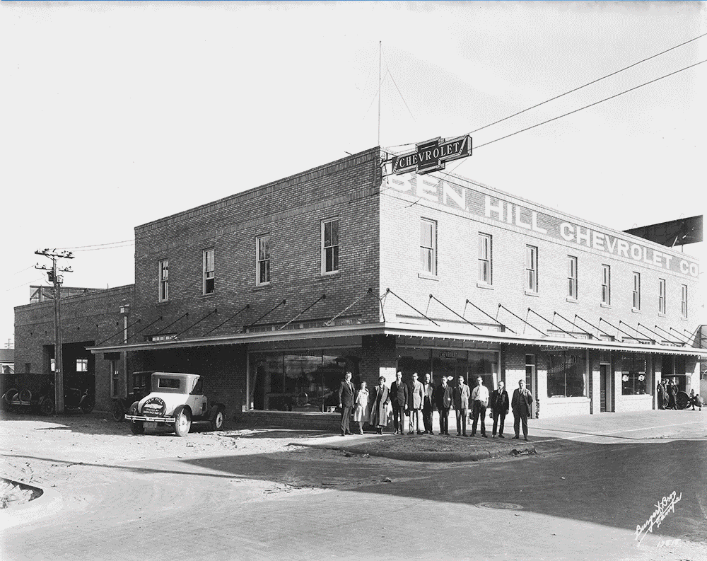 Ben Hill moved to Tampa in 1917 and opened his first Chevrolet dealership in 1924. However, by 1926, as his business grew, he found it necessary to move into these new headquarters at the corner of North Oregon Avenue and Grand Central Ave(now Kennedy Boulevard). It was three times the size of his original store. The two-story building had the entire service department on the second floor, with a showroom, offices, and a parts department on the first. They even had a service man there overnight.