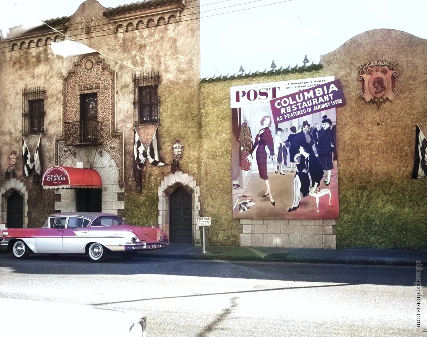 The Columbia Restaurant was featured in the Saturday Evening Post in January 10, 1959, and celebrated by placing a banner on the front of the restaurant. They also featured the article on what looks like a parade float, with women wearing waving lobster claws. The issue called it “a story of a remarkable Florida Restaurant, where food is served by some of the most emotional waiters in the business.” It went on to call it “Food for non-conformists.” Owner and restaurateur César Gonzmart must have been thrilled. The cover illustration, drawn by revered artist George Hughes, hung on the wall inside the restaurant. Look at that Chevy Bel Air out front. Notice the El Patio name and awning and The Sibony medallion on the building. While El Patio and El Siboney Dining Rooms still exist, the exterior design has changed considerably.