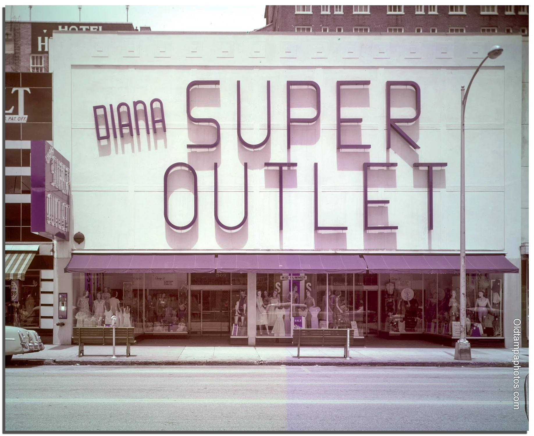 Diana Shops opened in the late 1930s at 907 Franklin St, next to the Grants Department Store. In 1947, they opened a second shop at 509 Franklin St, seen here. When they lost their lease next to Grants in 1954 and were forced to close, they consolidated their downtown operations and added the name Super Outlet. Selling women’s and children’s clothing, it was a prominent retailer in the middle of the 500 block of Franklin Street, joining Hanover Shoes, Schwobilt Clothing, Farner Shoes, and Jack Pendola’s Men’s Shop. In 1962, Diana’s had a grand re-opening, with a new men’s shop on the first floor and an enlarged infant’s and children’s department on the second floor. As retail business began to dwindle downtown in the mid-1960s, they expanded, opening a store at 1712 N. Dale Mabry, across the street from Montgomery Ward's, where the Wal-Mart is now. That warehouse store lasted until its liquidation in 1970. Records indicate the downtown store lasted until the early 1970s.
