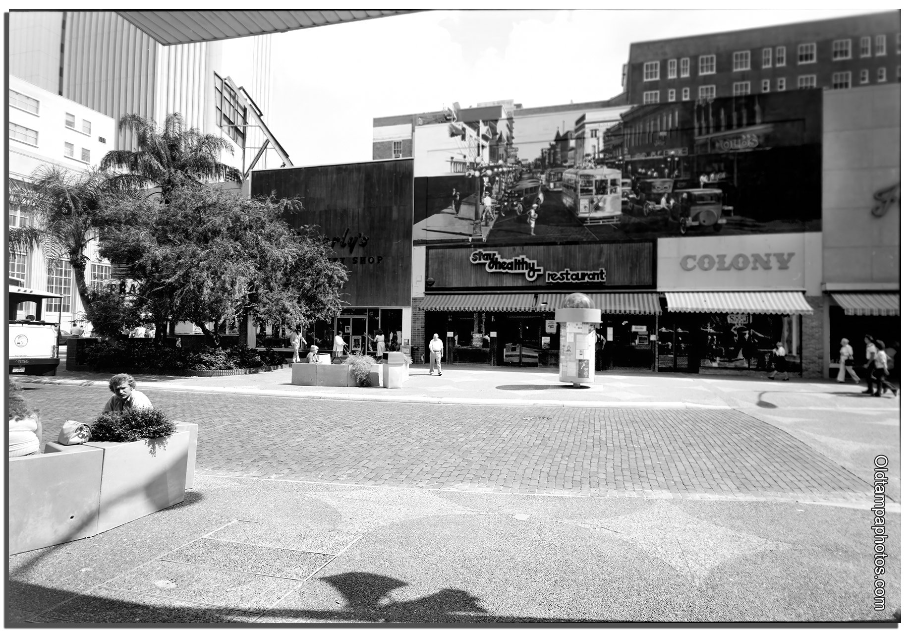 The downtown store took two storefronts in the 500 block of Franklin. In 1971, Steins Men’s Fashions moved into 511 Franklin St, and in 1974, Colony Shops moved in next door at 509 Franklin St. Richman Brothers took Stein’s spot in 1975 after the street had been converted into a pedestrian mall. The retail scramble continued in 1978 with the opening of Stay Healthy Restaurant in the spot. In an attempt to improve the aesthetics and increase foot traffic in 1979, the Tampa Community Design Center painted a mural of a 1925 Burgert Brothers photo of Franklin Street above both stores. It was fruitless. Both Colony and Stay Healthy closed in the mid-1980s.