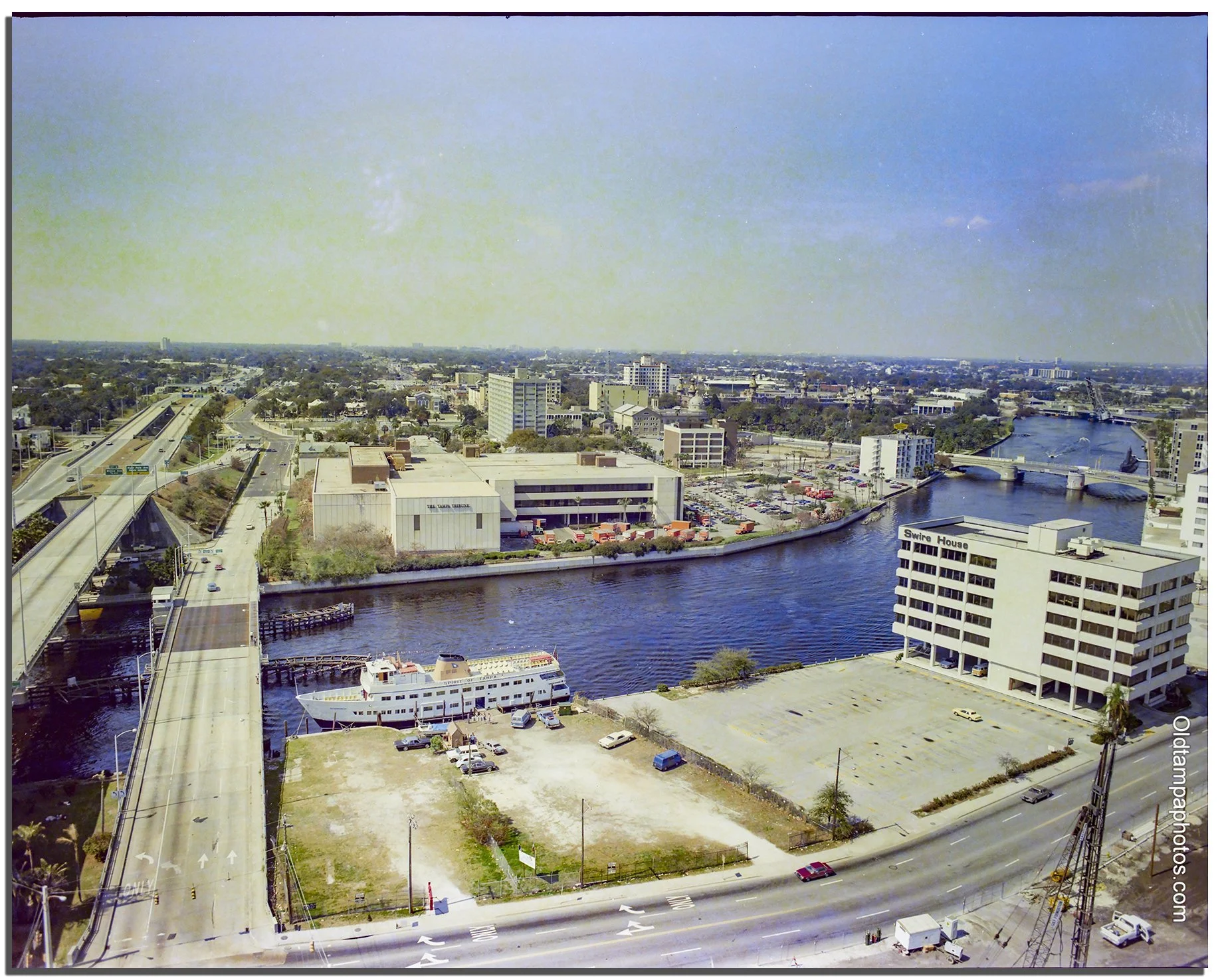 The Dinner Cruise Ship, The Spirit of Tampa, is docked at the corner of Brorein St and Ashley Drive in Tampa. Circa 1985. © The Gandy Collection. Courtesy of the University of South Florida Digital Collection
